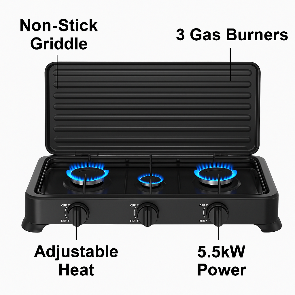 Conecta la estufa a una fuente de gas segura, abre la válvula y gira la perilla deseada para activar el quemador. Regula el calor según lo necesites.